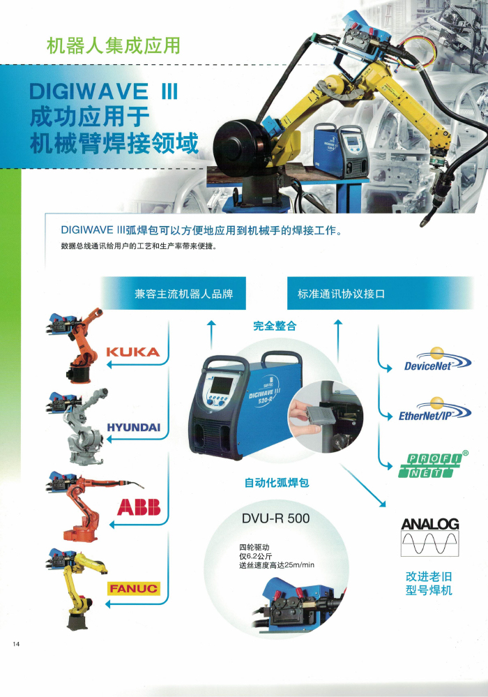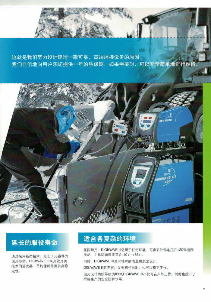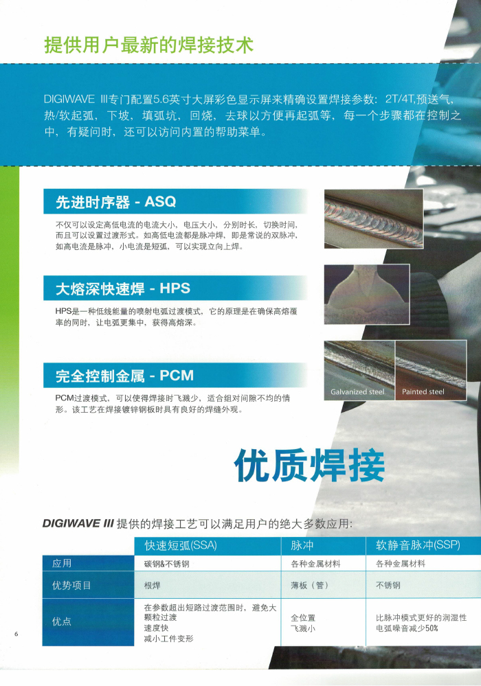 本系列 MIG 焊機集八大技術革新和專利技術( “ 柔性 ” 短弧 / “動態”短弧 / 低噪音脈沖 / 超射流模式 / 熱起動 /4 階程 / PR-SPRAY 系統 / 定序功)于一身,是目前較先進的鋁合金 MIG 焊機之一。獨到的熱起弧功能保護在起弧處充分熔合,大于 700A 的熱起弧脈沖峰值電流擊碎表面氧化層準確而連續地控制脈沖參數,同時對焊接峰值電流不進行限制。