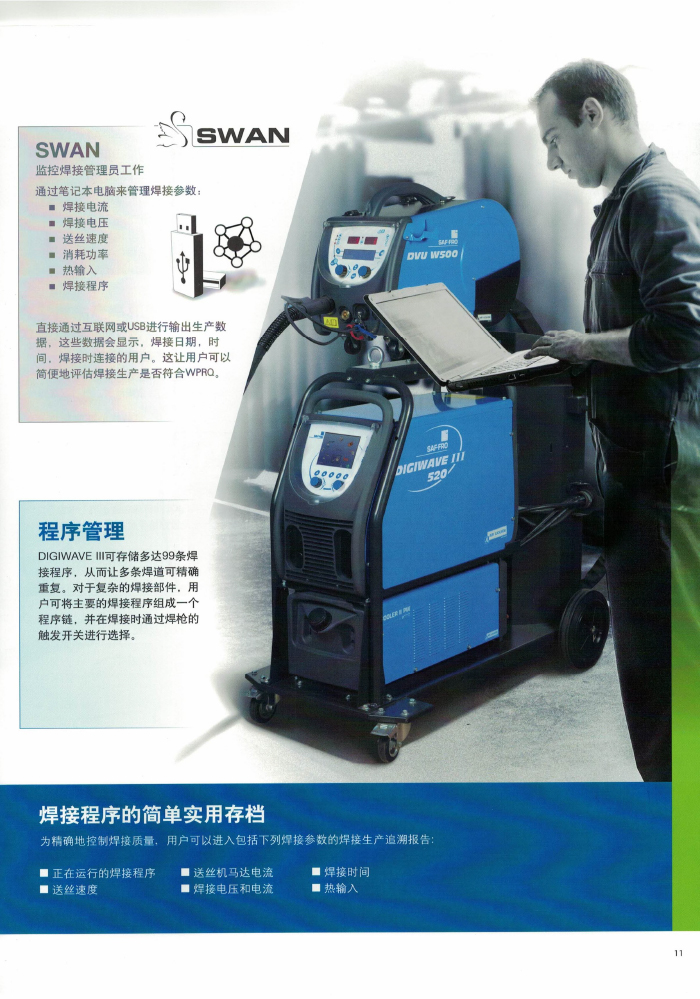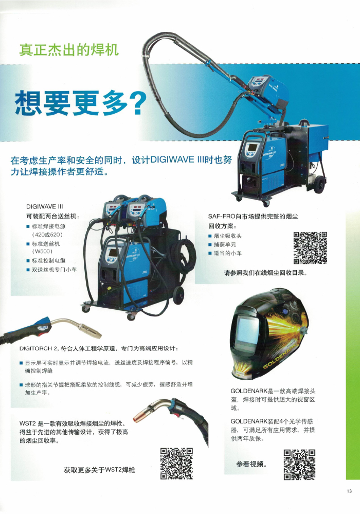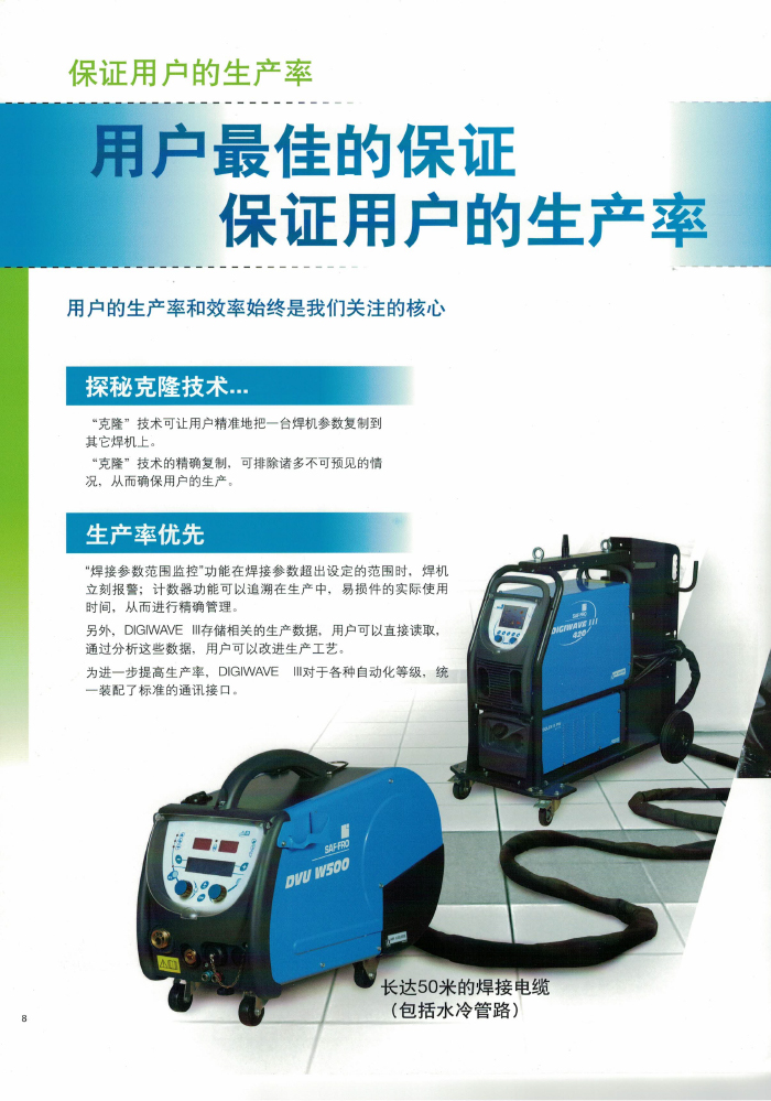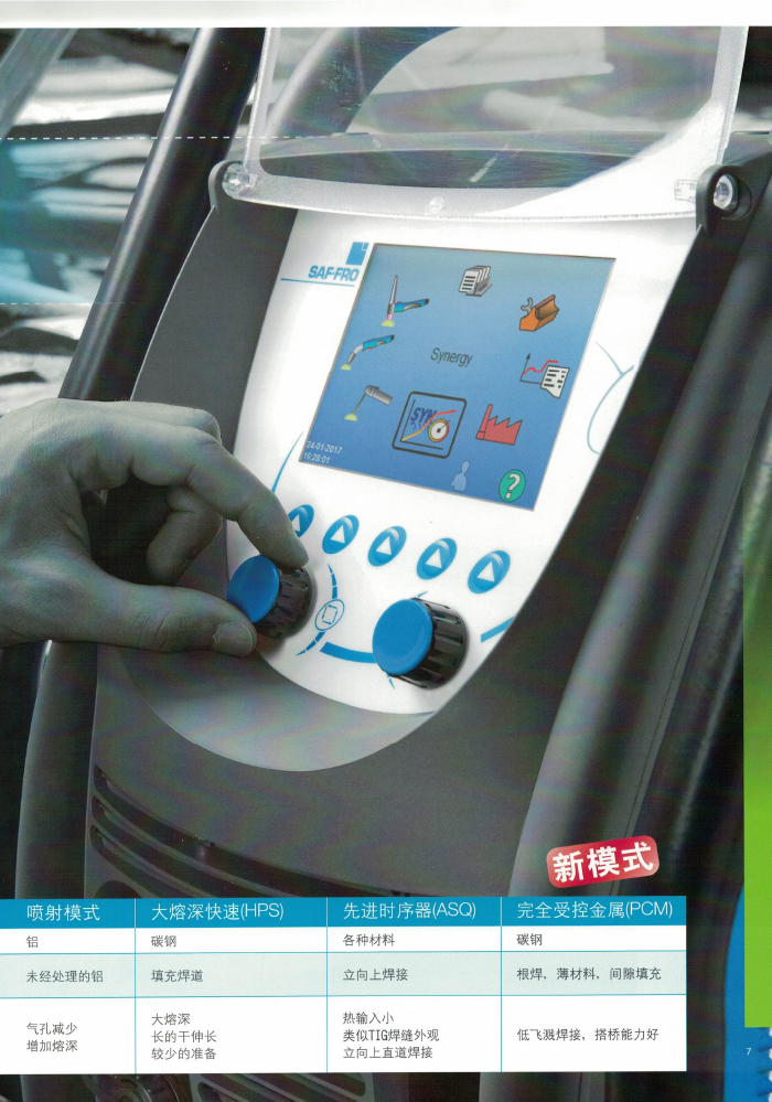 真正實現一個脈沖過渡一個熔滴,該專利工藝采用電弧射流型突變技術,焊接電流以肯定的頻率產生突變,從而引起焊接熔池強烈攪拌,使氫在熔池凝固過程中充分溢出,因此很大地減少和消除氣孔地產生。 SAF 分司的專利射流過渡技術之于傳統的 MIG 焊射流過渡更具有廣泛的應用性,并能實現全位置的焊接,在汽車、造船、高速列車、航天航空及壓力容器等制造領域得到廣泛應用。 SAFMIG330TRI/480TRI 脈沖熔化極氣保護焊機為 16 位微處理器閉環數字控制晶體管暫斬波電源、焊機內焊接專家系統,各種母材,焊絲,氣體組合焊接程序達 100 多組,協合式單旋鈕調節,具有熱起弧功能,此外還設置了“雙脈沖”功能,適用于鋁及鋁合金,不銹鋼,碳鋼及低合金鋼的焊接。